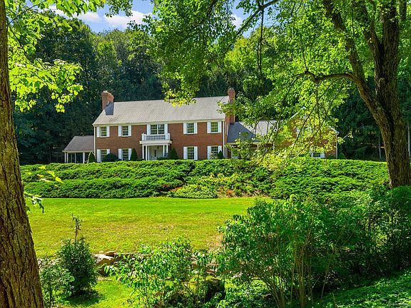 Through stone columns along a scenic approach is this first time on market custom-built five bedroom brick house on four private acres. Spacious rooms with 10ft ceilings and detailed mill work on the main floor include a cathedral height family room with dramatic fireplace, a front-to-back living room, a wood paneled office, and a four-season sun room to enjoy the stunning property. The large bonus room with bath and hardwood floors has just been approved as a fifth bedroom and is large enough to be divided into a bedroom and second office, playroom, or sitting room. The custom wood-paneled kitchen overlooking a natural setting has top quality appliances. The property includes a fenced pool, flat lawns on two levels, and a man made pond for skating and fishing. The lower level has a marvelous game room with wet bar, a full bath, a gym, and a large cedar closet. The landscaping is lovely without being high maintenance. A private patio outside the kitchen and family room is convenient to the pool and is the perfect place to grill. The pool has recently been refinished, the driveway refinished, and the pond dredged. Electric on the property is buried.The 3-car garage has high ceilings, good storage and a separate entry pad for each door. Move in and live comfortably or customize this stately home. An amazing opportunity. All measurements approximate. Ring camera system active at exterior. St. Lukes School and Grace Farms are in close proximity. Health department has approved 5th bedroom and paperwork is being finalized by town.