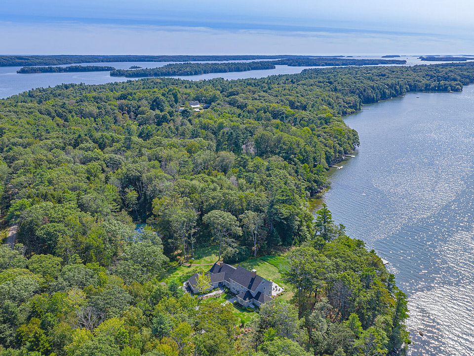 Breathtakingly set at the end of a long, winding drive lined with gardens, apple, peach, and plum trees, this 14-acre oceanfront estate feels worlds away while being close to everything. The exclusive entrance opens to reveal a stunning, newly renovated Shingle-Style home with lush lawns, tennis/pickleball court, new dock, & westerly views that light the sky with spectacular sunsets. Reimagined from the studs up, the home is a masterclass in coastal luxury, blending timeless architecture, craftsmanship, designer details, & state-of-the-art systems. The cobblestone circular drive sets a gracious tone, and the moment you step inside, floor-to-ceiling Marvin windows & doors frame a dramatic ever-changing canvas of sea & sky. At the heart of the home, a chef's kitchen invites gathering, complete with handcrafted cabinetry, marble counters, walk-in pantry & coffee station. The dining area flows into the fire-lit living room, where French doors open to a stone patio with firepit, the perfect stage to watch the sun melt into the horizon. The tiered seaside lawn invites celebrations from tented weddings to intimate evenings under the stars. The first floor also offers a family room w/ fireplace, library, guest suite & mudroom with dog wash for four-legged friends. Upstairs, a study with fireplace, guest bedroom, and spa-like primary suite, open to sweeping ocean views, along with a creative artist studio or additional bedroom. Revel in salt air on a peaceful screened porch, or step outside to a meandering path to the tennis court, freshly lined for pickleball matches. From your dock, launch a kayak, or swim in the pristine waters of Maquoit Bay. Just four miles from Bowdoin College & downtown Brunswick, voted one of the nation's top towns to live & retire due to its vibrant cultural scene, restaurants, Maine State Theater, Amtrak station & proximity to Portland. A rare offering with an extraordinary balance of privacy & connection ~ nature & culture.