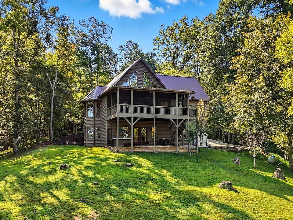 Down a quiet country road, you'll find 650 Myna—a home where mountain views stretch endlessly and a wide river sparkles below. It's the kind of setting that feels like a peaceful retreat yet close enough to conveniences when you need them. Inside, the soaring great room greets you with a stone fireplace, tongue-and-groove ceilings, and a wall of windows framing the outdoors. The open kitchen and sunny dining nook make gathering easy, while the seamless flow to the expansive decks and screened porch invites you to linger. The main-level primary suite is light and airy with windows that bring the outside in, and its adjoining bath provides a private retreat. The second bedroom on the main level is just as sweet and spacious, with a large full bath just steps away. Upstairs, a loft offers flexible living space, complete with an additional bath and a spacious bedroom tucked away under charming angles. The terrace level opens up a world of possibilities: a bright family/media room, a fitness area, additional bath, and walk-out access to the backyard. Step outside and unwind in the hot tub, perfectly placed for soaking in the river and mountain backdrop. From the welcoming front porch to the screened-in deck, from the cozy fireplaces to the lower-level retreat, this home was designed for comfort, gathering, and peace. 650 Myna isn't just a house—it's a sanctuary where every detail celebrates the beauty of its surroundings.