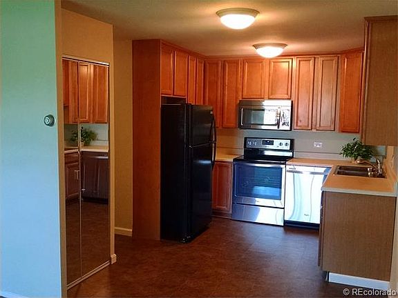 One of the best locations on the golf course! Penthouse corner unit with vaulted ceilings. Remodeled and move right in condition. This 2 bedroom/ 1 bathroom condo features updated ginger stained cabinets in the kitchen, laminate flooring, and all included appliances are stainless steel. Bathroom features updated vanity, flooring, & fixtures. 2 tone paint throughout, with updated doors, electrical switches/outlets, & lighting. Newer wall A/C unit, plus additional storage on same floor. 1 car detached garage with opener. Denver's largest active adult living community, age 55+. HOA includes heat, taxes, water, activities, 24-hour patrolling community responder, club house with amenities, and more!