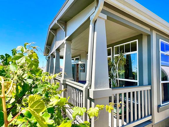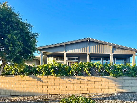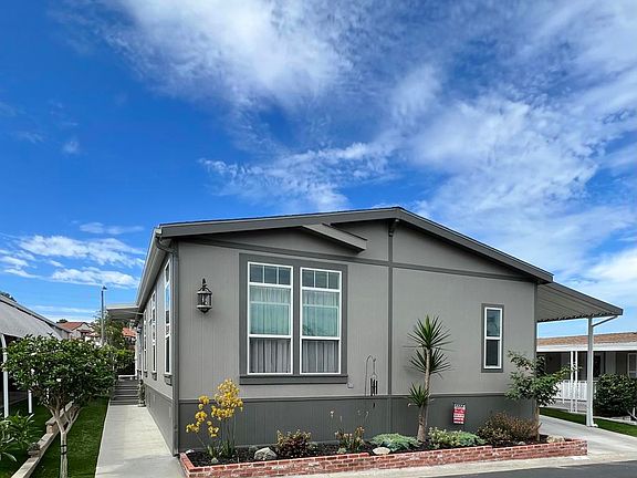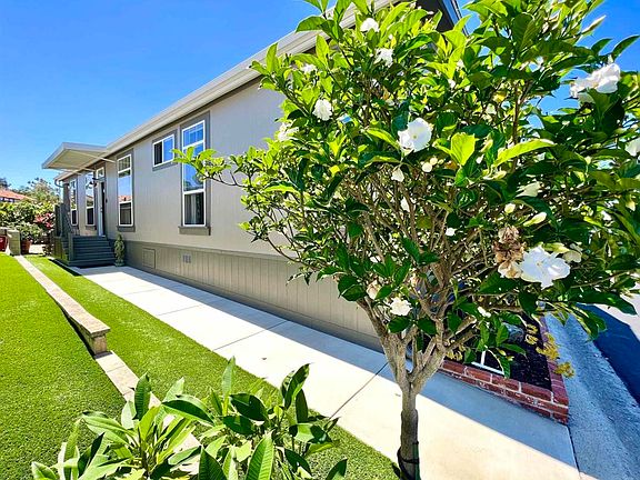 PRICE REDUCED for QUICK SALE. Night and Day: this is an entertainer's dream home, featuring spectacular sunsets and Pacific Ocean views. About this home: Just reduced for a quick sale, this spacious 3-bedroom, 2-bath 2016 home in highly desired Palomar Estates East has partial ocean views. This light and bright home sits on the crest of a hill and has a 1680 sq ft open floor plan upgraded with plank vinyl flooring and Berber carpet in living areas, 9-foot ceilings with additional 8" coffered areas, crown molding throughout, and dual-pane windows. Beautiful exterior paint was just completed this year. Cold A/C & Ceiling Fans throughout. Kitchen: features a large 3 1/2' x 7' center island, quartz countertops, and stainless-steel Samsung appliances. Laundry: Quartz counters, and pass-through white cabinetry offer plenty of folding space and storage around the Speed Queen washer AND dryer. Elegantly large 5.5' x 30' covered Factory porch, maintenance-free artificial turf and DG yard, and 5x12' shed with finished loft for easy holiday storage. Palomar East Mobile Estates is an active 55+/35+ Senior Community with City-Protected rent-control, magnificent clubhouse for weekly events, saltwater pool and jacuzzi, gym, pickleball AND tennis courts, dog park, putting green, and more. Within the Community, this home is located near putting green, bocce courts, barbecue area, and the coveted West Gate Access for easy traveling! Located ONLY minutes from local Carlsbad & Encinitas beaches, plus convenient shopping and restaurants surround the community to the West, South, and East. HCD: 2016 Golden West GLE Series by Clayton. Serial: PER037504CAA/B Room Dimensions: MBR: 15' x 16' Guest: 14.5' x 11.67' Guest 2: 11' x 12' Living Room: 14.5' x 20' Dining Room: 10' x 12' Kitchen: 10' x 15' Utility: 7' x 8' Drapes vary. Blinds: 2" white Carpet: Beige Berber (commercial quality) Vynil: gray wood plank style Landscaping: artificial turf on E & W sides Low water planter on drip in front Porch with view & grape trellis in back DG in SE corner and behind porch Rear Cement Patio behind shed: 10' x 14' Appliances: Water softener A/C Samsung Stainless fridge Frigidaire Stainless D/W Built in Samsung Stainless Microwave Samsung Stainless Gas Stove/Oven Washer: White Speed Queen Dryer: White, Gas, Speed Queen White Hardwood Cabinets throughout White Quartz Countertops throughout Trex Porch