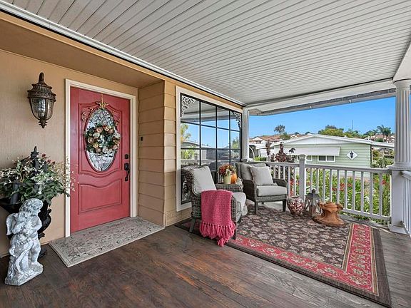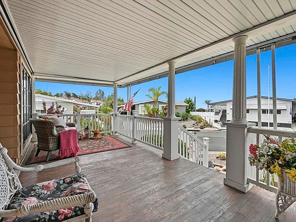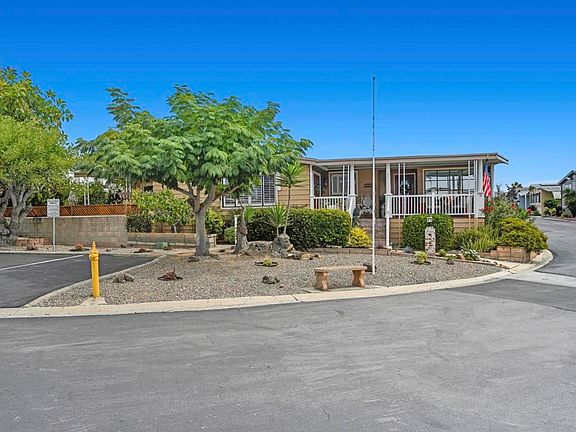 Sip your margarita while you enjoy your peek-a-boo ocean view sunset from your large custom porch in the beautiful and spacious 2 bedroom 2 bath located on a gently sloping corner lot surrounded by gardens, porches, patios, and views! Uniquely private and useable lot is completely landscaped front, back, and side yards. Low water succulents and plumeria in front, lime, lemon, and avocado in back and delicious fig on the side yard. The large home has been wonderfully updated with space for formal living area, family area, and a den/office. The large open kitchen with views to the west is perfect for the chef of the house. Enjoy a large master bedroom with over sized closet and slider to a private patio. Get ready for fun community activities or just unwind in your remodeled bathroom with quartz counters, lots of cabinet space and a claw foot tub. Large lot is one of the most spacious in the Community and adjacent to 3 guest parking spaces and shady tree on the West side of home. Walking distance to putting green, lawn bowling, and picnic area. The community has a pickleball, pool, tennis courts, club house and community events! Walk to shopping, bank and restaurants. Located just a short drive from Carlsbad, Encinitas, Vista, or Escondido, this freshly extensively renovated home is Move-In Ready! No property tax. Space fee is $584 per month and includes water/trash /sewer