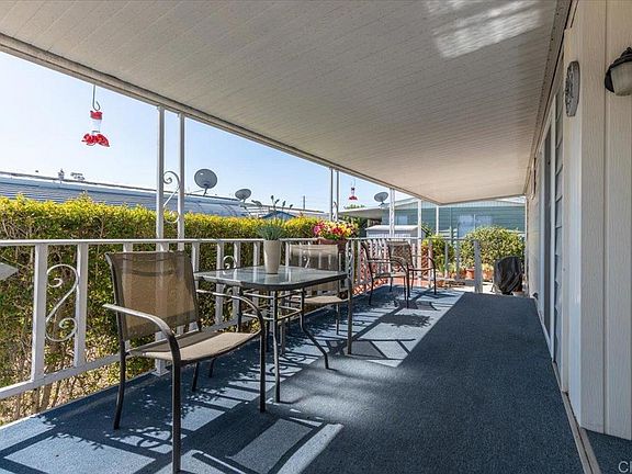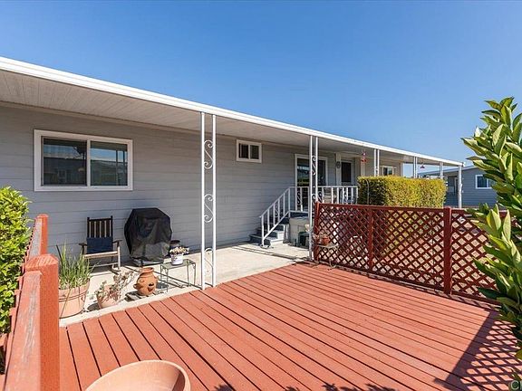 2 bed / 2 bath located in a 55+ rent controlled park with NO property taxes (home is still on HCD registration). But what truly makes this property special is the oversized lot—larger than most in the neighborhood. The expansive yard is perfect for anyone who loves to garden, BBQ, or spend time outdoors with friends and family. Whether you’re hosting summer get-togethers on the spacious wood deck, relaxing on the covered raised porch, or picking fruit from your very own orange tree, this home is designed for both comfort and enjoyment. Two storage sheds add extra convenience and are only allowed when grandfathered in like in this case. The interior of this home boasts fresh interior paint and thoughtfully added recessed lighting, making the interior feel light, bright, and freshly updated. The windows and flooring were replaced in approx. 2018. The roof was replaced in approx. 2010. There are separate Living and Family rooms, plus an office desk nook. The Primary Suite boasts double sinks, a walk in closet, and separate step in shower and soaking tub. Some of the furniture is available if desired! Palomar Estates East is a very active and social 5* community - check out the photos to see some of the amenities this community has to offer! Convenient to shopping, restaurants, Lake San Marcos, two golf courses at Lake San Marcos, another golf course nearby off Twin Oaks, entertainment, lots of parks and trails, the San Marcos Senior Center, and just a short 8 mile drive to Carlsbad beaches! Monthly space rent is only $635.65 and is under rent control!