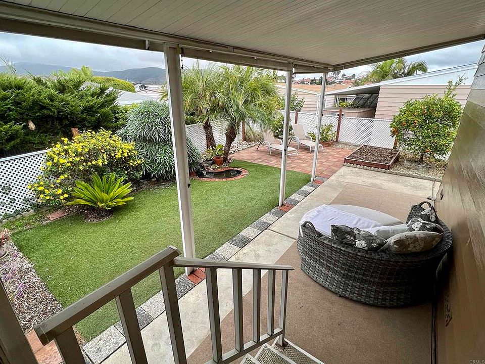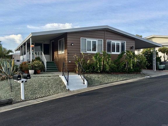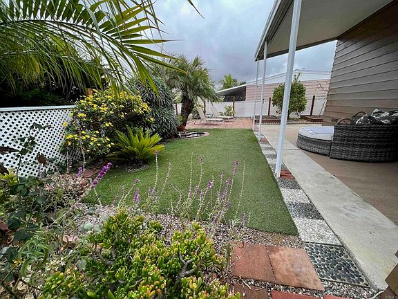 This desirable 55+/35 senior living private community, is Rent Controlled with low space rent (~$675.00), NO Prop.Taxes, & low reg. fees. This home is within walking distance to the lofty Clubhouse, pool, spa, and HOA amenities. The home boasts one of the larger lots in Palomar Estates East. It is beautifully landscaped with a fenced yard, mt. views, fruit trees, and privacy. A CA Room provides Bonus Living space. It's location, 7-10 miles to beaches, captures coastal breezes yr. round. With nearby restaurants, groceries, & shopping, plus beautiful Lake San Marcos and its golf courses a mile away, this home is a MUST SEE!