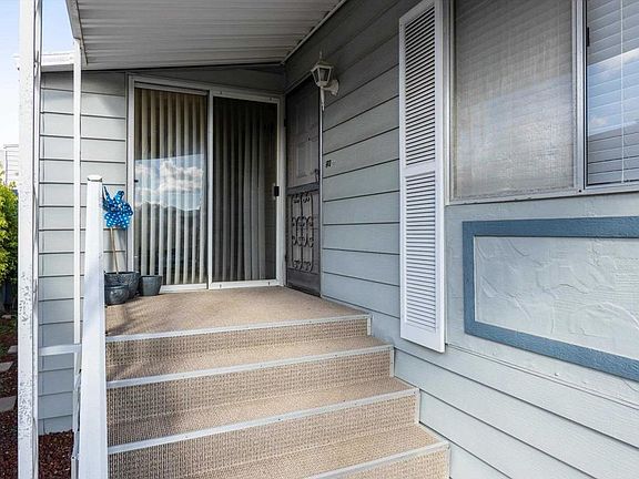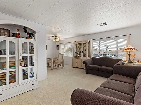 2 bed / 2 bath located on an elevated VIEW lot in a 55+ rent controlled park. No neighbors across from you means no obstructions in your beautiful panoramic views of the hills and valleys to the East, the snow caps to the North East, and the morning sunrise! Interior is very light and bright. The spacious Kitchen offers plenty of space for a breakfast nook. 3 ceiling fans plus central A/C. The Primary Bathroom offers 2 sinks and a separate tub and shower. The spacious Guest Bedroom also has it's on ensuite Bathroom. All appliances convey and many furniture pieces are available to be included as well. An enclosed porch offers extra living space or storage. There is a private patio behind the home and a large storage shed. Palomar Estates East is a very active and social 5* community - check out the photos to see some of the amenities this community has to offer! Convenient to shopping, restaurants, Lake San Marcos, two golf courses at Lake San Marcos, another golf course nearby off Twin Oaks, entertainment, lots of parks and trails, the San Marcos Senior Center, and just a short 8 mile drive to Carlsbad beaches! Monthly space rent is only $658.32 and is under rent control!