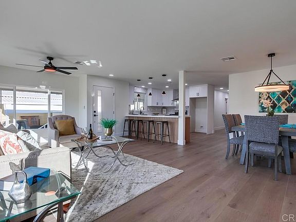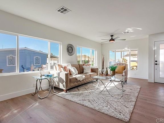 Stunning remodeled home in highly desired Palomar Estates East. A three bedroom and two bath home is a unique find in this community. The living, dinning, and kitchen are joined in a wonderful open concept. The beautiful kitchen has quartz counter tops, stainless steel appliances, a single basin stainless steel sink, and pendent lights. Dual-pane windows and sliding glass door as well as new A/C and furnace will keep the home comfortable in the temperate San Marcos weather. Primary bedroom has a walk-in closet and an on-suite bathroom including a dual-vanity with shaker cabinets, quartz counter tops, a beautiful walk-in tile shower with dual shower heads. The California Room off of the third bedroom gives you extra space not included in the square footage of the home. New plank vinyl flooring throughout the home. Fan lights in the living room, primary bedroom, and guest bedrooms. The home has a new roof as well. A private back patio and backyard allows you to enjoy the beautiful San Marcos weather. The carport stairs are two sided allowing for easy access. There are two storage sheds for you extra things. This home is on HCD registration which means NO PROPERTY TAXES. Palomar Estates East is a 5 star 55+/35+ senior rent controlled park with many activities and amenities including a beautiful clubhouse, pool, spa, gym, putting green, pickleball courts, and tennis courts. This home is located minutes to Lake San Marcos dining and golf as well as local Carlsbad beaches, shopping, and restaurants.