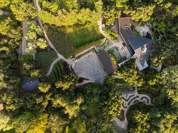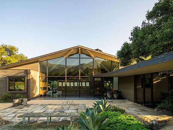 A rare midcentury modern architectural offering in the heart of Montecito, The Erving House, described as a glass tent'' by Time magazine in 1951, is a singular expression of architectural and landscape mastery, gracefully nestled on 2.7 acres of private, artfully curated grounds. Designed in 1950 by renowned architect Lutah Maria Riggs during her iconic modernist phase, and complemented by the legendary California landscape architect Thomas Church, this estate exemplifies the essence of indoor-outdoor living.Enter through private gates, where a meandering driveway weaves beneath a canopy of majestic oaks, setting a serene, cinematic approach to the residence. It culminates in a spacious motor court, where the home's striking flat-roof carport seamlessly marries form and function with timeless elegance.A covered walkway leads to the home's entrance, where a dramatic double-height foyer with floor-to-ceiling glass walls flood the space with natural light and frame expansive views of the surrounding landscape and mountains. This breathtaking entrance sets the tone for a home in constant dialogue with nature.The main living space unfolds with a soaring pitched ceiling, its apex seemingly reaching toward Montecito Peak, and a sculptural, biomorphic Santa Barbara stone fireplace, a subtle homage to Brazilian architect Oscar Niemeyer, Riggs' contemporary and collaborator. Walls of glass, both fixed and sliding, span the length of the room, opening to terraces and gardens and dissolving the boundaries between inside and out.The primary suite is a private retreat, featuring a spa-like bath, dual large dressing rooms, and tranquil views of the gardens and the coastal range. The home office offers inspiring solitude, framed by vistas of mature landscape and mountain ridgelines.The European-style kitchen is outfitted with custom Poggenpohl cabinetry and top-tier appliances, crafted with the serious chef in mind. The adjoining formal dining area also enjoys views of both the northern mountains and the home's terraced gardens and native flora beyond.Adjacent to the main house is a detached studio, providing flexible use, as a guest bedroom, creative workspace, or private retreat, its large windows revealing the natural beauty of mature oaks. Across the property is a serene 1-bed, 1-bath creekside guest house offering peaceful accommodations far enough from the main home to feel entirely its own.The grounds have been thoughtfully revived by landscape architect Susan Van Atta, who honored much of Church's original vision while adding her own artistry through native plantings. Wander through fruit orchards, lavender fields, and raised vegetable gardens, or enjoy a game at the bocce ball court. Additional features include a high- functioning well with RO system for landscaping and a full power backup generator. The Erving House is more than a residence, it is a living piece of architectural history and one of Montecito's most important homes.