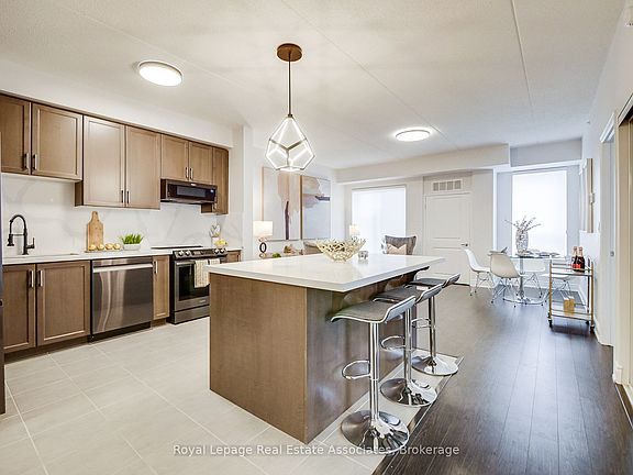 Beautifully upgraded executive-style corner unit offering 1,000+ sq ft of modern luxury. This bright 2-bed, 2-bath home features rich wood flooring, updated baseboards, sleek sliding glass doors, and designer LED lighting throughout. The stunning gourmet kitchen showcases quartz countertops, a stylish backsplash, a large island, and brand-new black stainless steel appliances. Spacious primary suite includes a spa-inspired ensuite with double sinks and a large glass-enclosed shower. Custom roller shades in every room add comfort and sophistication. Completely move-in ready-an exceptional opportunity for those seeking turnkey, upscale living in a prime location.