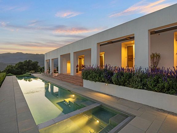 Sitting on top of the world! With one of Ojai's most dramatic settings, this mid-century inspired 2-bedroom, 2-bath home sits atop an oak-studded saddle ridge, offering breathtaking views of mountains, valleys and open sky in nearly every direction. Designed by notable AIA architect Darwin McCredie, the home seamlessly blends linear architecture with modern comforts, all while highlighting the natural beauty of its surroundings.Floor-to-ceiling glass doors invite the outside in, showcasing the panoramic vistas from every angle. Whether you're lounging on the expansive terrace, swimming laps in the infinity-edged pool, or gathering at the outdoor fireplace with friends, every moment here is filled with a quiet serenity and wonder.Outside, two acres of the 2.9 acre property are dedicated to a young but flourishing avocado orchard, promising a bountiful harvest of 'Gem' avocados. An agricultural meter offsets water expenses for this and the tastefully landscaped grounds. There's also two horse stalls and a fenced pasture, so there's plenty of space for your furry friends to roam.Whether you're seeking a peaceful getaway retreat or a permanent residence, this hill-top oasis is the perfect sanctuary and offers the best of both worlds. Don't miss your chance to experience your own slice of Ojai paradise!!