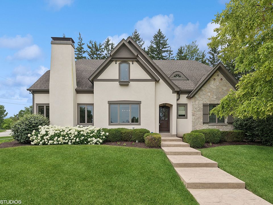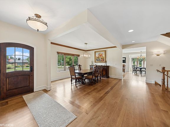 This exceptional, custom-built residence perfectly blends elegance and comfort, offering an unmatched living experience. Situated on an oversized corner lot, this home boasts French provincial design and incredible curb appeal, ensuring you'll fall in love at first sight. As you walk up the seal-stamped concrete pathway, you're greeted by an inviting covered front porch with solid wood front door. Enter through the grand entrance and be awed by the wide-open floor plan, where casual elegance shines in every detail. The living and dining rooms set the stage for unforgettable gatherings with friends and family. Exquisite finishes throughout include 9' ceilings, Knotted Pine solid wood doors, and 5" White Oak plank hardwood floors, marble, and porcelain tile extend throughout the home. The gourmet kitchen is a culinary enthusiast's delight, featuring a large custom island, Wolf 6-burner cooktop with pot filler, dual stainless steel Decor wall ovens, a KitchenAid side-by-side refrigerator with a wood panel cover, a Miele dishwasher, a vent-a-hood cooktop vent, and professional cabinetry with pullout drawers. The adjoining sunny breakfast room is perfect for morning coffee. Cozy up in the hearth room, complete with a gas log fireplace with marble surround, bathed in natural light. The first-floor owner's retreat offers picturesque views of the backyard. The spa-like ensuite bathroom features dual vanity sinks, a walk-in shower, and a spacious closet, providing a tranquil escape. Ascend the custom-wood staircase to discover three additional bedrooms, each with walk-in closets and custom-built shelving, a home office, a Jack and Jill bathroom, and a massive finished bonus room above the garage. Practical and luxurious amenities include a new Electrolux front loader washer and dryer, utility sink, and a walk-in closet with floor-to-ceiling custom built-ins, leading to an extra-deep, oversized 3-car garage with new garage doors. The unfinished 2,142 sq. ft. basement offers 9' ceilings and is ready for your finishing touches, with metal framing already in place for a spacious recreation room, a home gym, storage, a wine cellar, and rough-in plumbing for a bathroom. Step outside into your private backyard sanctuary. Mature trees and a wood fence provide shade and privacy, complemented by a seal-stamped concrete patio ideal for outdoor lounging and gatherings. The in-ground sprinkler system ensures the landscape remains lush and vibrant. Enjoy the convenience of being steps from Clauss Recreation Center with outdoor walking paths and a fitness center. Just minutes to downtown Roselle's eateries, shops, Starbucks, library, Metra, and major highways. Quick access to O'Hare Airport. Spring Hills Elementary, Roselle Middle School, Lake Park High School. Don't miss this opportunity to make this luxurious haven your own. Welcome home!