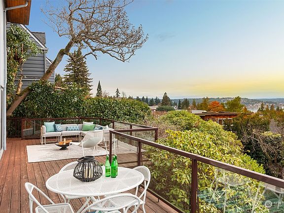 A perfect example of true NW mid-century style, this Seth M Fulcher, architect-designed home has been treasured by the same family for 43 yrs! Landscaped for privacy w/an unassuming exterior profile, you'll be wowed by the feeling of spaciousness from two stories of towering windows which capture breathtaking views of Mt Rainier, Lake WA & the Cascades. The remodeled kitchen & dayrooms w/gleaming hardwoods lead to a wide, private deck. Contrasting ceiling heights define spaces w/out disturbing the main level open plan. Tucked on the south side is a cozy den. Upstairs 4 bdrms & 2 bths flank the mezzanine studio & sweeping views are seen from almost every room. Live near all NE Seattle offers & enjoy central AC, 2 car parking & oversized lot.