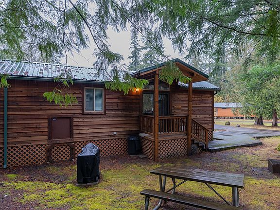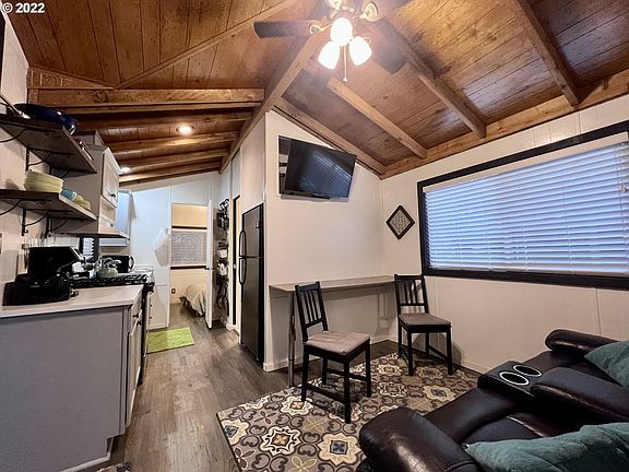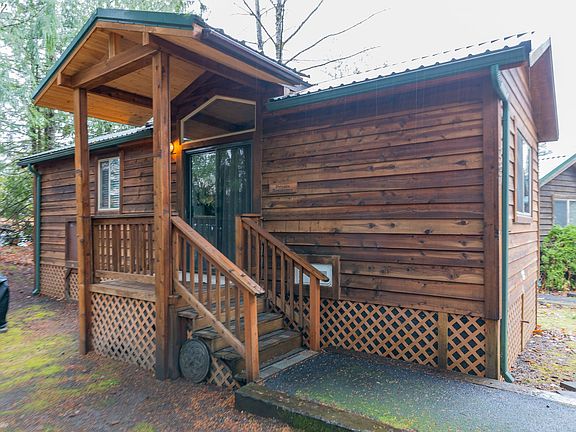 Adorable rare 2 bedroom cabin close to so many amenities! Tiny home living at it's best. Beautiful wood ceilings. Updated with new quartz countertops and faucet in the kitchen. Enjoy coffee on your covered front porch with a new roof covering to enjoy nature year round. New stain on the cedar siding to enjoy. Comes partially furnished. Don't miss your chance! Property cannot be used as a rental. Park rent will change with the new owner.