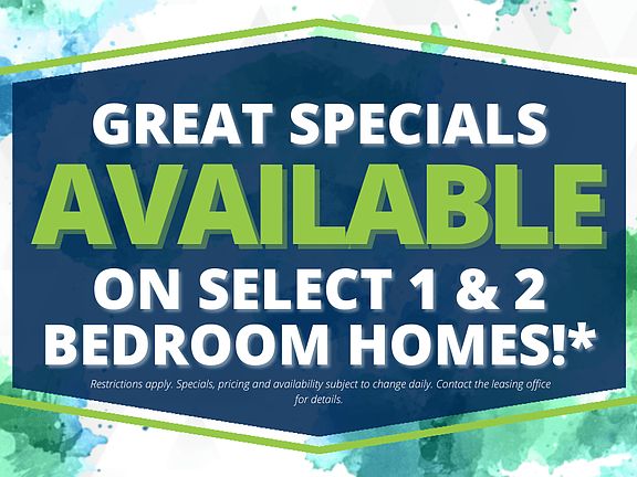 - Special offer! Great Specials Available on Select 1 & 2 Bedroom Homes! *Restrictions apply. Specials, pricing and availability subject to change daily. Contact the leasing office for details.