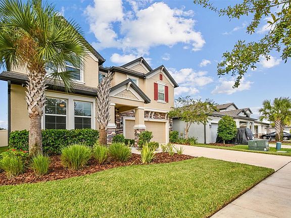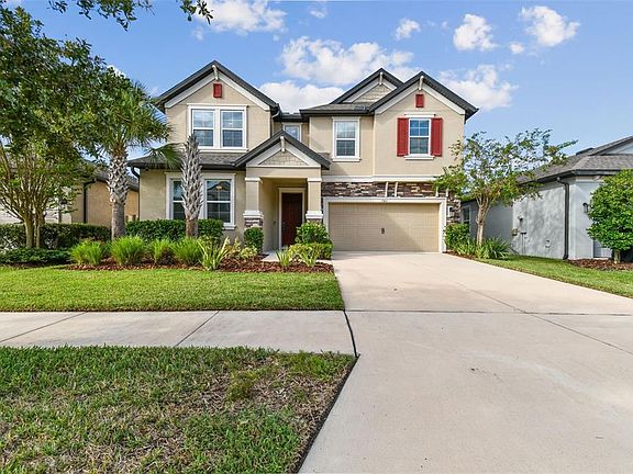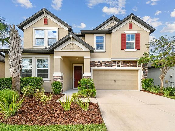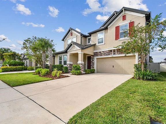 Nestled in the gated community of Wesbridge, this stunning 3BR/2.5BA pool home with a flex room, loft, and 2-car garage combines elegance and functionality. The open floor plan features soaring ceilings, a sun-filled living area, and a gourmet kitchen with granite countertops, stainless steel appliances, wall-mounted oven and microwave, glass cooktop, modern backsplash, and an expansive island with deep basin sink. Upstairs, a spacious loft, convenient laundry, and all bedrooms await, including the luxurious primary suite with dual vanities, walk-in shower, and large walk-in closet. Step outside to your private retreat with a covered patio, resort-style pool and spa with water features, and a fully fenced backyard with paver deck. Community amenities include a luxury pool, playground and dog park. Ideally located near I-75, SR 54, and Curley Road, offering quick access to downtown Tampa, Gulf beaches, shopping, dining, and more.