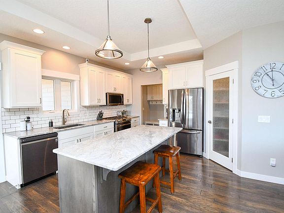 LOOKING FOR A MASSIVE GARAGE without sacrificing all the upgrades you deserve inside the home? 4+ stall garage boasts a 10 ft tall door on the 3rd stall that also stretches 45 ft deep! It's also set up with floor drains, water hookups & a gas heater. The curb appeal provided by the side load design is a glimpse into the plethora of upgrades inside! Engineered wood floors greet you upon entry and stretch throughout the Great Room...living space features a gas fireplace & tray ceiling...dining area offers a door to the covered deck...kitchen boasts white cabinets, dark stained island, granite counters, GAS RANGE & a walk-in PANTRY! From the garage entrance is a large mudroom with laundry & adjacent half bath. Three main floor bedrooms & two additional baths includes the master suite with tray ceiling, walk-in closet, tile shower & double sinks. NINE FOOT CEILINGS in the massive lower level family room that includes game table area, another fireplace & walk up wet bar with full size refrigerator. Bedrooms 4 & 5 are good sized & there is also another full bath. Additional features include a privacy fenced back yard with sprinkler system!
