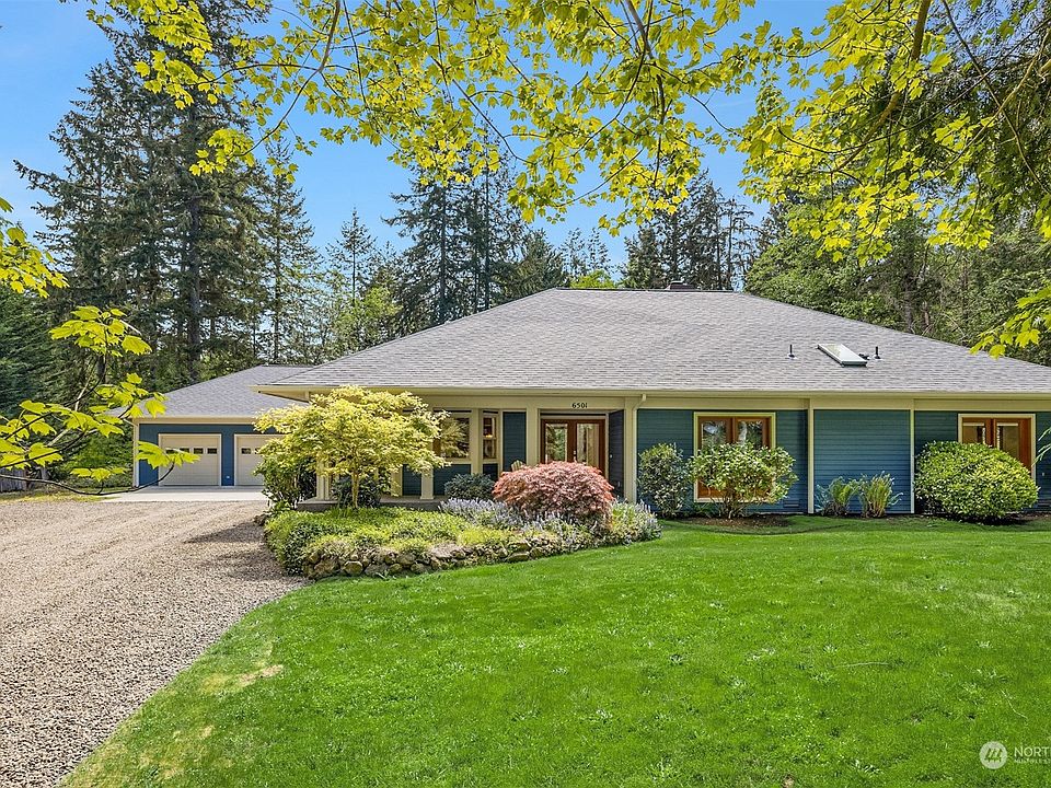 This fabulous ranch-style home is just steps away from the entrance of Gazzam Lake for trail hikes and adventures! The one-level home is sited on 1.430± acres with wonderful sunlight and lots of room for play and gardening—ready for easy Island living. Built-in bookcases, hardwood floors and French doors lead out to a large covered porch for grilling and entertaining, even if it’s raining! Large primary with French doors out to a private deck and two additional bedrooms. Extra large 3-car garage and a separate studio/guest space including 3/4 bath. New roof just installed and furnace/heat pump replaced. An excellent value and perfectly located on the Island.