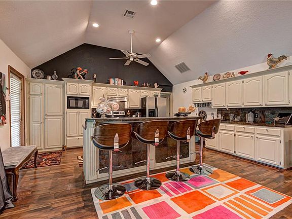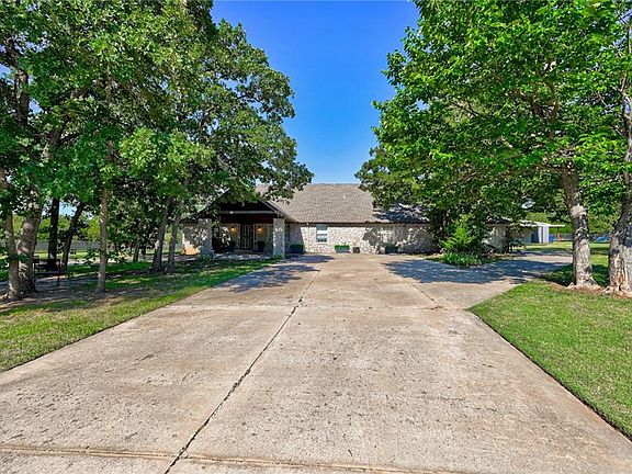 Immaculate and meticulously maintained gated estate with night lighting! This rare find offers five completely fenced, manicured tree-lined acres with your own private stocked pond with bridge and island. A 1,600 sqft shop is perfect for hobbies and offers two horse stalls with direct access to a fenced area with water access. Nearly $100,000 spent remodeling, including a new master wing complete with a 13x11 walk-in closet and bonus room. Opaque blue modern glass barn door leads to your spa-style bathroom with 24x24 temp controlled floors with touch thermostat, Soho 72" deep soaking tub, steam shower (self-contained) with 20 massage jets, dual rainfall shower heads, and handheld faucet. Other upgrades include: Pergo oak wood flooring and base molding, granite window sills, newer roof, newer furnace/coil, new stainless appliances, storm shelter, newer light fixtures, two fireplaces (1-touchstone in-wall recessed electric fireplace in master). Only 15 minutes to Tinker/ Boeing!