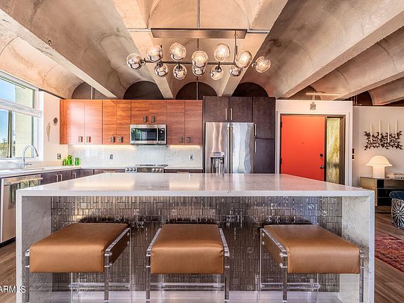 Step into a world of exquisite design and architectural beauty in this mid-century loft that is nestled above the Murphy Bridal Path on North Central Avenue. This home's open concept living space is an ideal fusion of luxurious comfort and artistic design centered around the stunning concrete barrel vault ceiling. The kitchen features two tone and patterned kitchen cabinetry, open-shelving, Caesarstone counters & backsplash, stainless appliances and a refrigerator with a built-in coffee maker. The oversized island boasts Paul Evans Cityscape inspired metal mosaic tile. Conveniently located just moments from Uptown's eateries & shops with easy access to the freeways & airport. Offered for sale with furnishings included. Can easily be converted to a one or two bedroom. New HVAC in May 2024.