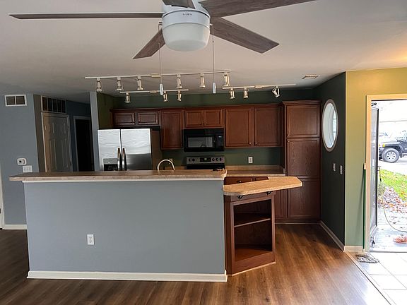 Newly installed stove, microwave and refrigerator. vinyl hardwood flooring.