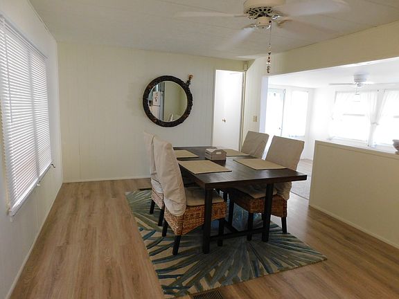 This partially furnished home features an inviting open floor plan with split bedrooms for enhanced privacy. Just off the main living area, a spacious Florida room offers added comfort and flexibility-perfect for lounging, hobbies, or additional entertaining space. Both bedrooms feel airy and welcoming. The primary bedroom includes a convenient built-in desk, ideal for computer work or home organization. The front bedroom features twin beds and its own half bath, making it a great space for visiting guests. The main bathroom is thoughtfully designed with a double vanity, separate mirrors, and a walk-in shower equipped with grab bars for added safety. An enclosed, screened-in area provides a relaxing spot for morning coffee or quiet evenings outdoors. Overall, this home delivers comfort, versatility, and plenty of potential-just waiting for your personal touch. Hawaiian Village, a tropical paradise, is an Active 55 Adult community - the monthly Fee Package includes: Land-Lease, Lawn Service and use of Amenities for only $867 (No Additional Taxes or Fees). Hawaiian Village is pet friendly up to 25 pounds with a maximum of two pets. This home offers a great location and a fantastic selection of amenities including a large club house with free WIFI. Our club house is also a host home for Bingo every Thursday evening (during season), monthly community dinners as well as periodic dances and concerts. Enjoy our pool (heated for winter), and engage in a game of pool in our New Activity Building that also has a fitness room and card/poker tables. We also have a library, shuffleboard! Lawn service is also included. It is conveniently located close to the Sarasota-Bradenton International Airport (2.5 miles) and offers access to Florida's most beautiful beaches. Call today to schedule a tour to see how this nice home can be yours in this highly sought after community.