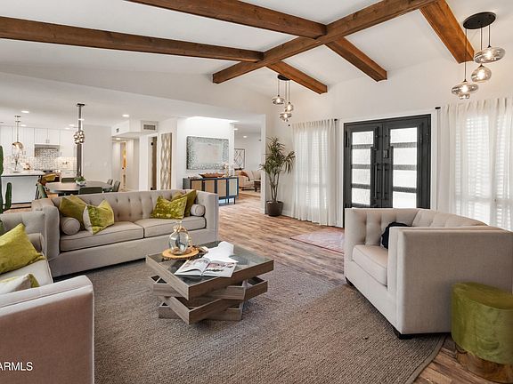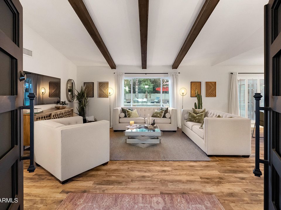 Modern kitchen is open to the dining room & 3 living spaces. These gathering rooms are complete with gorgeous designer finishes, tiles, quartz, & fixtures. Custom island features new shaker cabinets & tasteful hardware. Large walk in pantry. Living room has vaulted ceilings w/ exposed wood beams. The adjacent family room is perfect for entertaining around the beautifully showcased fireplace. BONUS sunroom offers yet another place for family & friends...or perhaps a gym or office w clear view of the pool.