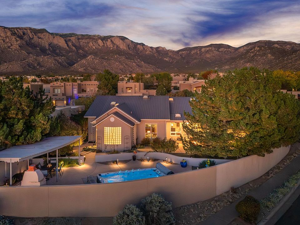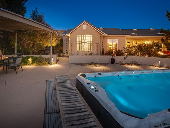 Elegant custom High Desert one-story on a beautifully landscaped and oversized corner lot boasts both mountain and city views. Inviting courtyard entrance leads to vaulted beamed ceilings in living room and kitchen. This 4-bedroom, 3-car garage home has many recent upgrades! Huge kitchen island surrounded by custom cherry cabinets, subzero refrigerator and wolf oven and cooktop (cooktop replaced in 2020). Master bath recently enlarged with vaulted ceiling, dual showers and heated tile floors. Relax outside in the endless pool spa or take in the sunset by the gas firepit, both new in 2022. Other features include pitched metal roof, recirculating hot water system, electric window covers, Variance painting and warm oak wood floors throughout. Don't miss this meticulously maintained home!