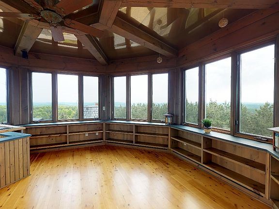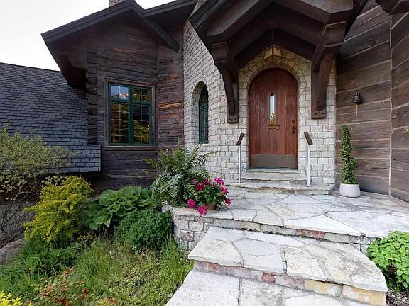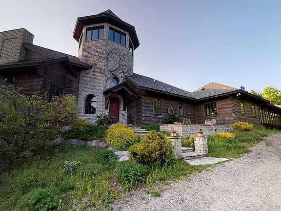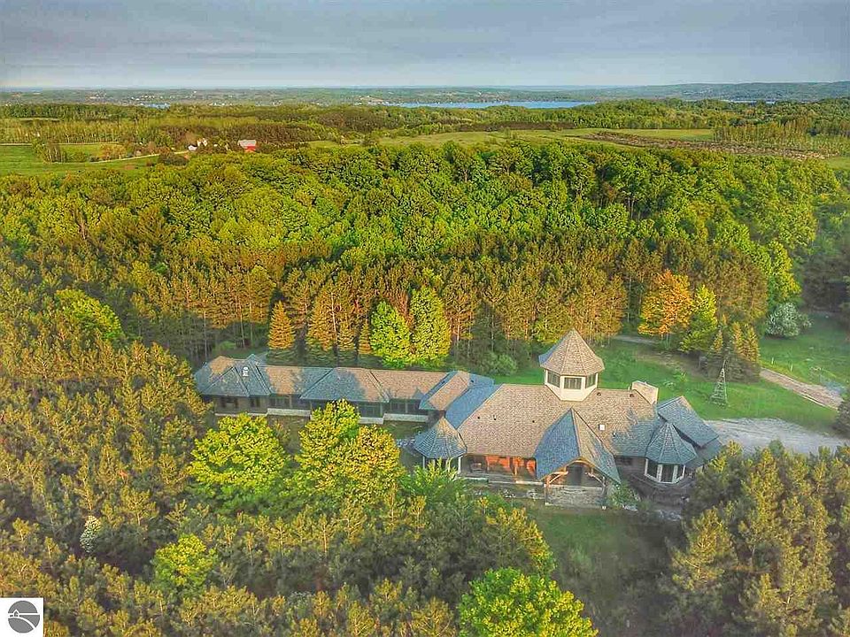 Escape to the magic of Leelanau in one of the county's most artisan crafted homes. Custom details by local expert makers fill this premier place, crafted with hand hewn pine logs, chinking, fine masonry work of natural stone, slate, Australian cypress, and solid cherry wood details. Dream exclusivity with private drive winding to home perched on large secluded hill presenting stunning panoramic views of the 165+ acre property (open meadows, woods, streams) and miles beyond of natural beauty. The observation turret provides even more scenic experiences: distant views of Lake Michigan, Manitou Islands and Sugar Loaf Mountain; This castle-like tower is also perfect as a reading or mindfulness space. A number of rooms to entertain in: open kitchen/dining/breakfast nook (with Viking and Subzero appliances), billiards room (featuring a wet bar), home theatre (carpeted wall paneling), indoor swimming pool room (with massive windows and access to outside), great room (boasting exposed beams and built-ins). The extravagant architecture and materials are visually appealing, but also provide comfort of modern niceties: Couples walk-in closets (other two bedrooms also feature walk-in closets), couples separate master baths (including steam shower and oversized soaking tub), full guest suite (kitchen/dining, bath, bed, living), massive pantry (custom cabinetry and rolling ladder), main level living, and sauna. Two-story log barn with private paddock. Built with energy consciousness, this home features solar panels, solar water heat (radiates floors too), wind turbine (renewable energy) and drought resistant landscaping (water conservation). Cost and energy savings! Minutes from sandy beaches, hiking, restaurants--and not far from Traverse City's attractions and amenities. This property has endless possibilities: sustainable agriculture for farming enthusiasts, destination event (wedding, corporate) venue, retreats (artist, writing, yoga), vineyard with estate chateau, + more!