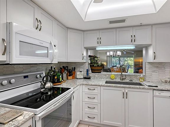 This meticulously updated second-floor condo includes a Class A Golf Membership to award-winning Tara Golf & Country Club, where you'll enjoy immediate access to a newly renovated 18-hole championship course, resort-style amenities, and an active social scene. Whether you're an avid golfer or simply looking for a vibrant, amenity-rich community, Tara is the place to be. Step inside to find a beautifully updated kitchen featuring a brand new composite double-sink, MOEN faucet, and garbage disposal, along with new quartz countertops and a marble backsplash. The adjacent dinette/bar area includes custom soft-close cabinetry and drawers, a built-in lazy Susan, and matching quartz surfaces and backsplash - a perfect blend of function and style, making entertaining guests easy. The spacious layout includes a primary suite with direct lanai access and sweeping golf course views, along with a large walk-in closet with custom built-ins and ensuite primary bath. The guest bedroom and updated second bath are located on the opposite side of the unit for added privacy. Both bathrooms feature spacious walk-in showers. The open living area offers ample space to relax or host friends, and the laundry closet includes built-in shelving for added storage. Enjoy peace of mind with electric hurricane shutters enclosing the lanai - ideal for locking up when traveling and for added storm protection. Living in Tara means more than just golf. Residents enjoy two pools, a state-of-the-art fitness center, bocce ball, bridge, and new pickleball courts coming Fall 2025. After a day on the course, or at the pool, unwind at the Grill Room or meet friends for cocktails at the Club’s lively gathering bar. Tara is perfectly located just off I-75, minutes from UTC Mall, Sarasota Airport, Lakewood Ranch Main Street, and the Tampa/St. Pete metro area. This thoughtfully updated condo offers the perfect blend of comfort, location, and resort-style living with golf at your doorstep. Don't wait - schedule your private showing and start living the golfer's dream today!