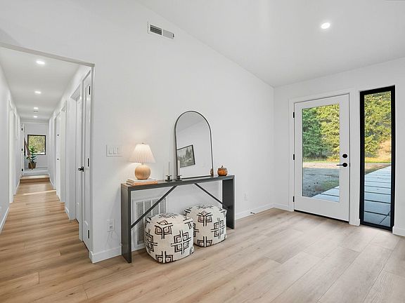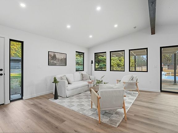Striking a perfect balance of mid-century cool and brand-new construction, this fully rebuilt 4-bed, 2.5-bath rancher sits on ¾ acre in Nine Mile Falls—just minutes from Riverside State Park and the Spokane River. Taken to the studs and updated in 2025, every system and surface is new: Milgard black-framed windows, LP composite siding, updated roof structure with lifetime shingles, new wiring, plumbing, high-efficiency gas furnace, central A/C, and electric water heater. The heart of the home is a showpiece kitchen with deep navy cabinetry, quartz countertops, subway-tile backsplash, stainless appliances, and a spacious island with bar seating. Vaulted ceilings and an exposed beam define the airy great room, which opens to a covered patio and fenced in-ground fiberglass pool for effortless indoor–outdoor living. A serene primary suite features a spa-inspired bath, and a detached oversized 2-car garage provides abundant storage and workspace. Owner financing and an adjacent 6–7k sqft parcel are also available.