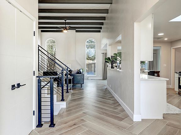An amazing contemporary split-level home near Arroyo Del Oso Golf Course! 5 bedrooms, 2 living areas both with fireplaces, & a heated pool with an automatic pool cover. Wood look tile floors throughout, & custom tile work in all 3 bathrooms. Kitchen has ample quartz counters, stainless steel appliances & an opulent walk in butler's pantry. Primary suite is a true oasis on its own floor away from the rest of the home. Walk in closet & dressing area that is larger than some bedrooms! Separate tub, & shower with double sinks, make up station & water closet. Bedroom on the main floor with a 3/4 bath. Courtyard entry, with both front & back yards fully landscaped. Refrigerated air, water softener, thermal double pane windows & custom shades with black out in bedrooms.