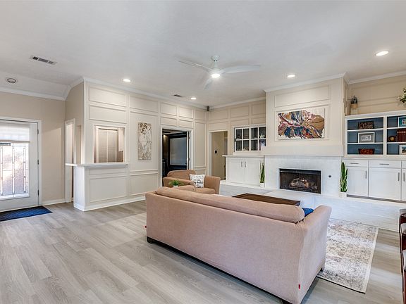Enjoy a low-maintenance lifestyle in this beautifully updated 3-bedroom home on a quiet cul-de-sac in the desirable Biltmore Swim & Racquet Club community with front-yard maintenance included! This home offers modern design touches and major system upgrades, including new roof (2019), complete replacement of all cast iron plumbing drain lines to PVC (2022), new water heater (2021), new HVAC and furnace (2023), new attic insulation (2024), new concrete driveway and entry sidewalk (2024), new board-on-board fence (2024), luxury vinyl plank flooring throughout, and fresh interior and exterior paint. The main living area features an open-concept layout with a large fireplace, built-in shelving, gas logs, and a wall of windows for natural light. A dry bar with a mini fridge and French doors open to the private side yard and covered porch, while the adjoining dining area and breakfast nook provide flexible spaces for casual and formal meals. The kitchen offers painted white shaker cabinets, granite countertops, stainless steel appliances, and a stacked-stone glass tile backsplash. The primary suite, tucked away for privacy, includes LVP flooring, dual sinks, a soaking tub, separate shower, and a spacious walk-in closet. Two secondary bedrooms share a guest bath with updated tile, and the bonus room with French doors can serve as an office, media room, or fourth bedroom. Enjoy quiet evenings in the private backyard with multiple seating areas, a covered porch, pergola with flagstone patio, and a 5 × 7 storage shed. The HOA provides front-yard mowing plus access to the community pool, tennis courts, parks, and green space. Walking distance to Bluebonnet Trail and Carpenter Park, and minutes from shopping, dining, schools, and major highways.
