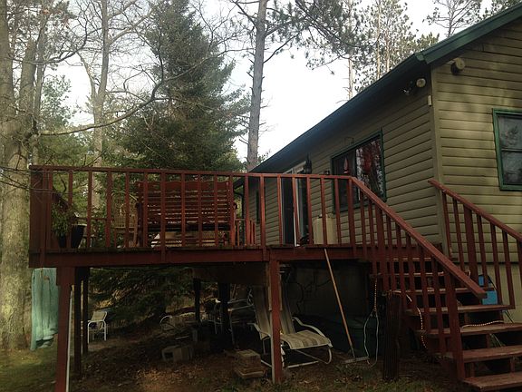 Charming, cozy and nicely finished in knotty pine with a unique hand-painted ceiling design. Home has 2 bedrooms and one bath with full basement. All new sewer, water lines and forced air furnace. Can be year around or seasonal. Trout pond in the front yard for anytime fish dinner. Great elevation and sandy frontage giving you beautiful sunsets over water. Near water fire ring for evening outdoor gatherings or use the lake side deck. Two garages and a bunkhouse. Nicely wooded lot at the end of Crocker Rd. provides a quiet peaceful setting on this 2+ acre property. Need more space? This cabin is part of a three parcel property including a 3 bedroom lake home and a vacant lot. Create your own family retreat! See more at duchesneauproperties.com