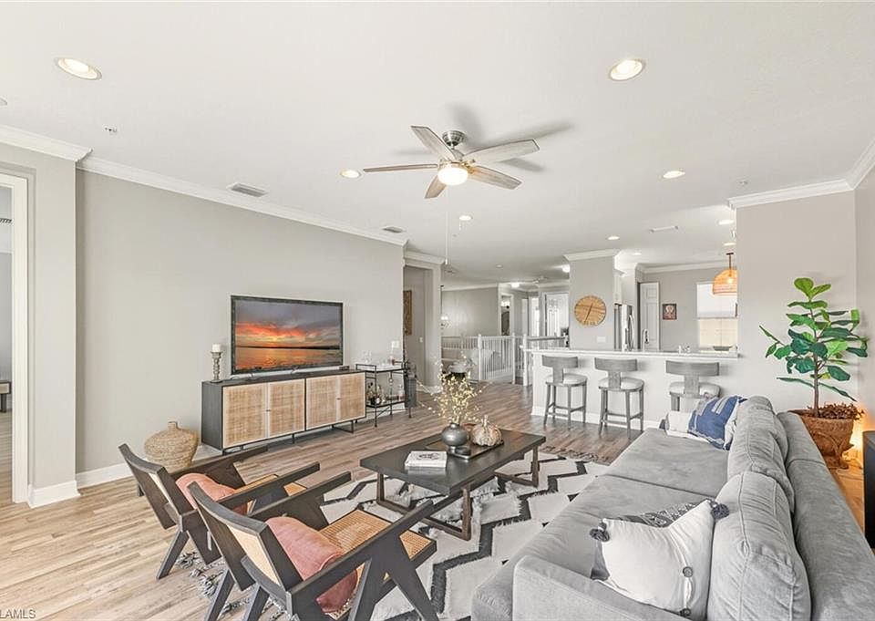 This beautifully updated second-floor condo features the spacious Fuller floor plan, offering 3 bedrooms and 2.5 bathrooms, with brand-new vinyl flooring, a modern kitchen with Café appliances—including a two-drawer dishwasher—and fully renovated second bathroom and half bathroom. Additional upgrades include a new AC system (2023) and washer/dryer for added convenience. Located in the highly desirable Marbella Lakes community, residents enjoy a family-friendly atmosphere and access to a stunning clubhouse (8,000 sq.ft.), resort-style pool, fitness center, indoor sports complex, billiards room, social hall, pickleball, tennis, basketball courts, (BOTH INDOOR AND OUTDOOR), playground and sun deck with a full-time social Directory curating, vibrant year-round lifestyle. The community offers 24 hour guarded gate security. With its prime location, only 10 minutes from beautiful white sand beaches of Naples, this property captures the essence of upscale Naples living perfect for both relaxing and entertaining.