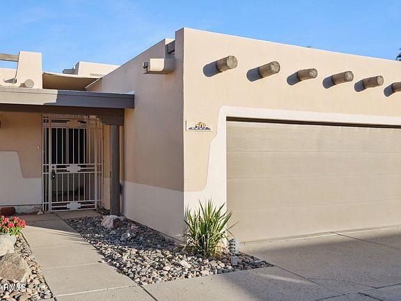 This 2 bedroom 2 bath townhome is in the small community of Pueble del Sol, 30 single story units with 2 car garages. Community pool, charming grounds and friendly neighbors! Great room has vaulted ceilings with lots of light and behive fireplace. HVAC System new in 2024. Newer dual pane windows, space for dining in the great room as well as an eat in kitchen. Primary bedroom has Brazilian cherry wood flooring and remodeled bath has a roll in shower. Lots of storage in this home including lots of garage storage cabinets. Conveniently located in North Central Phoenix, close to shopping, restaurants, schools and with easy access to freeway. See this one today!