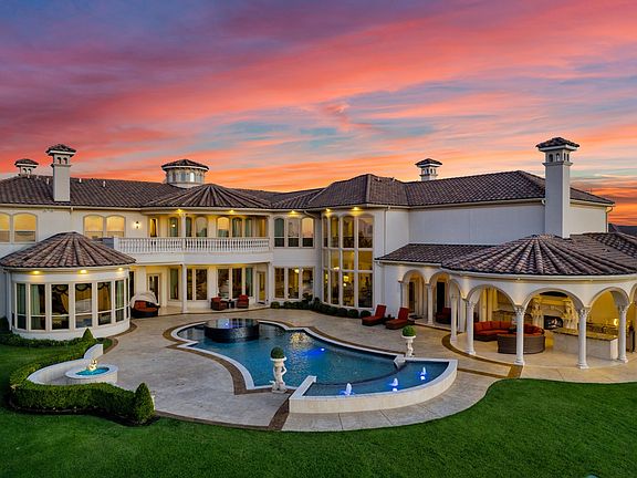 RARE OFFERING in guard-gated Kings Gate of Plano! This stunning Venetian-inspired estate by SIMMIE COOPER sits atop a hill on nearly 1 acre backing to greenbelt with breathtaking sunset views. Original owners present this architectural custom masterpiece featuring 6 bedroom suites, each with private baths, 6 full and 3 half baths, soaring hand-painted ceiling domes, and hand-carved Corinthian columns. Three exquisite motorized Swarovski chandeliers illuminate the grand spaces. Gourmet kitchen with built-in Viking appliances plus a separate full prep kitchen are perfect for entertaining large groups. The entertainment wing includes a 15-seat theater with motion seating and 163 inch screen, disco room with lighted floors and DJ booth, an expansive game room, and gym with sauna. Elevator serves all floors. A regal study with wood paneling and coffered ceilings offers a quiet place to work from home. Primary suite boasts dual custom closets, a fireplace, separate vanities, onyx countertops, and a Swarovski chandelier. Resort-style backyard features a pool, spa, fire pit, outdoor fireplace, full kitchen, and gazebo. Control 4 smart home system controls various aspects of the home from one screen. 4-car garage with epoxy floors and EV charging. This is luxury living with 5-star amenities and a chance to own one of the most beautiful architectural homes in Plano.