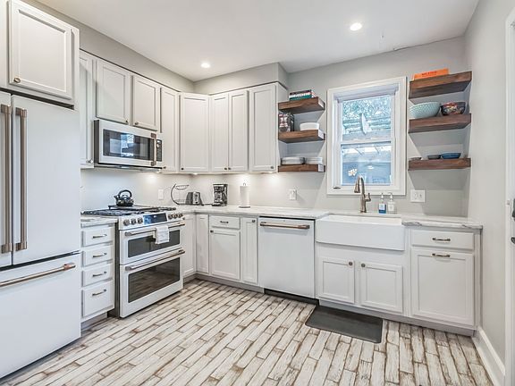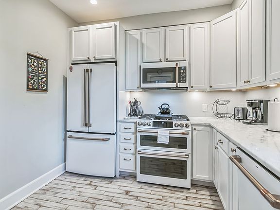 Beautiful flooringAttractive countertopsAll-white appliancesCeiling fanSeparate dining areaAmple cabinetry