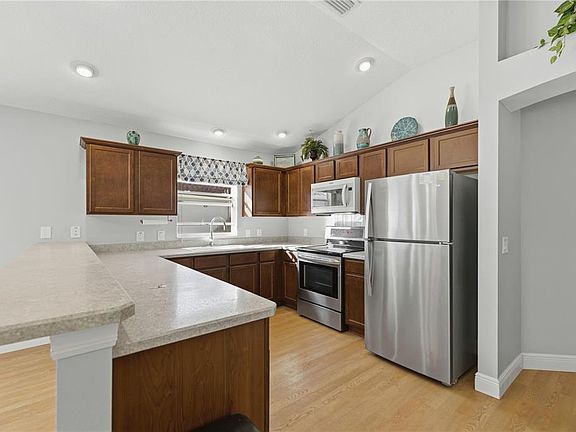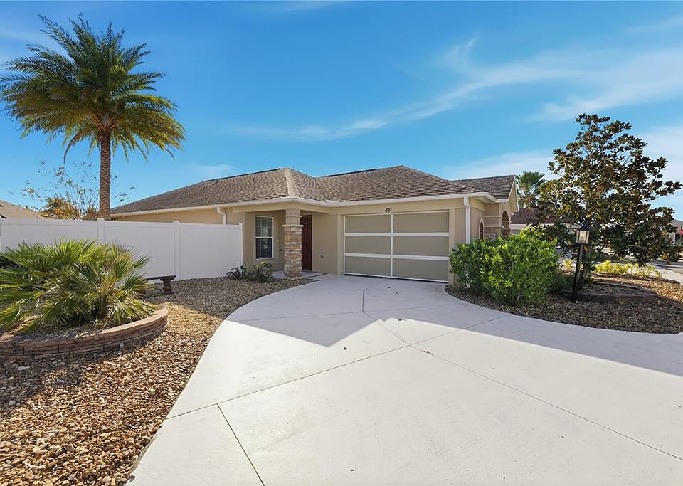Located in The Village of Hacienda of Mission Hills, this three-bedroom, two-bath Anaheim Model offers charming curb appeal and a seamless blend of comfort, style, and modern upgrades. NO BOND! Prepare to be impressed as you step inside to find vaulted ceilings, neutral colors, abundant natural light, and an open-concept floor plan perfect for both everyday living and entertaining. The spacious kitchen features beautiful cabinetry, abundant counter space, a counter-height bar, and stainless steel appliances. Enjoy INDOOR LAUNDRY, two sets of sliding doors leading to both the side patio and the lanai, and a large living and dining area. The master bedroom boasts a tray ceiling and a walk-in closet, while the en-suite bath includes a walk-in shower. The garage can easily fit a car plus a golf cart and still offers room for storage. Step outside to the screened-in lanai, which opens to an EXPANDED BIRDCAGE, creating a private and spacious outdoor retreat. This extended area provides the perfect setting for relaxing, entertaining, or enjoying the Florida sunshine, all while allowing for a seamless flow between indoor and outdoor living. Enjoy the expansive lanai overlooking a backyard finished with premium artificial turf—offering a beautiful, low-maintenance outdoor space you can enjoy year-round. NO CARPET—luxury vinyl plank flooring runs throughout the home for easy care and a clean, updated look. Just minutes from the popular town square, you’ll enjoy nightly entertainment, live music, restaurants, boutique shopping, and plenty of opportunities to dance the night away—all easily reached by golf cart. This home delivers the perfect combination of lifestyle, convenience, and comfort. ENJOY OUR VIDEO.