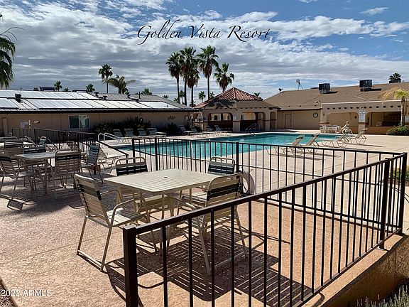 Come enjoy the Arizona resort lifestyle to the next level in this completely remodeled park model in this active community of Golden Vista. Two oversized full bathrooms (one with tub and one walk in tiled shower), full size water heater, 2 rooms to relax plus bedroom, updated flooring, stainless steel appliances including dishwasher, washer & dryer, and loads of space. Fully furnished and equipped for your ideal vacation rental & retreat out of the cold. Queen bed in bedroom with all linens and a fully stocked kitchen with all appliances! Sit out side and enjoy the AZ sunsets with Superstition Mountain views. Tenants agree to abide by the rules of the resort in all matters as stated in the current GV by-laws and C.C.&R.