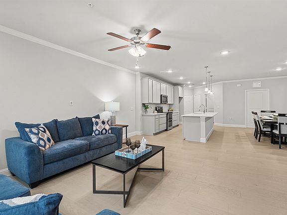 The kitchen includes stainless steel appliances, generous counter space, abundant cabinetry, and a large walk-in pantry. A spacious laundry room, prepped for a utility sink, adds even more storage and flexibility. Each building includes an elevator and inviting lobby areas that provide additional gathering spaces to connect with neighbors. The living area opens to a covered patio, perfect for morning coffee or a peaceful evening outdoors. The third bedroom provides flexibility for a home office, craft room, or guest space.