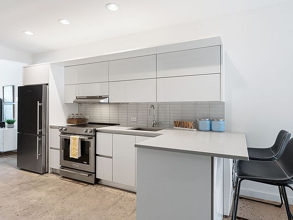This exquisite 1BR 1BA home offers a luxurious living experience with a private keyed elevator, providing direct access to your floor. A modern and elegant residence in the heart of Prospect Lefferts Gardens. Step inside to discover a thoughtfully designed space featuring floor-to-ceiling windows that flood the home with natural light and offer stunning views of the surrounding cityscape. The open kitchen, equipped with Bosch and Blomberg appliances, Caesarstone counters, and a breakfast bar, is a chef’s dream, perfect for culinary creations and entertaining guests.