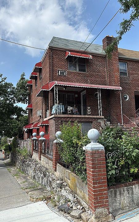 All-brick semi-attached corner property featuring sunshades over the windows and a spacious backyard.