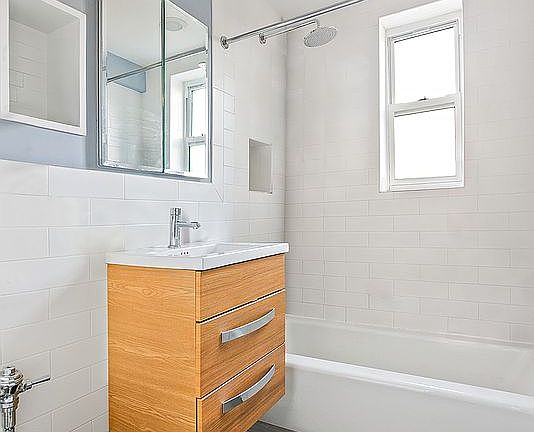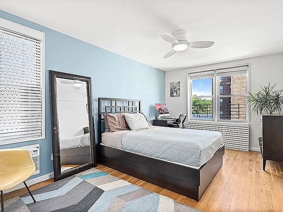 Step inside to a spacious living and dining area featuring a wall of built in closets and wide open views of Brooklyn’s treetops. The windowed eat in kitchen is equipped with high end appliances and abundant cabinet space for easy storage and prep.