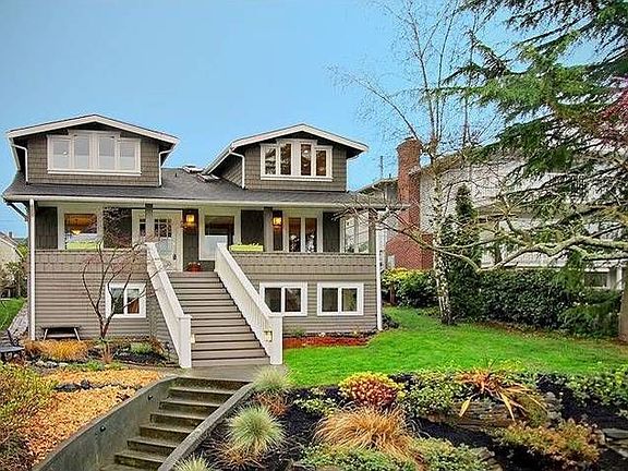 Enchanting Craftsman with captivating sound & mountain views! Perched high above street w/rocking chair front porch for a front row seat to glorious sunsets! This homes true soul shows in its original architectural details, blended w/extensive tasteful updates, many green. Three view flrs, 5 bdrms/2.75 bths, including a lovely daylight guest suite w/2nd kit. Lush organic gardens, private brick patio & potting shed w/power are the perfect urban oasis! 2-car off-alley pkg. Walk to cafes & shops!