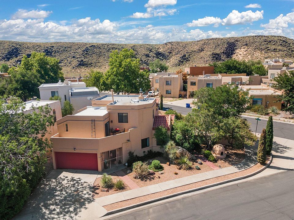 This beautifully custom-built 4-bedroom, 3-bathroom corner-lot home in Santa Fe Village, a fantastic opportunity! Remodeled kitchen and bathrooms (2022), New TPO (8/2024), New 30 yr shingle (8/2024), New Spanish tile on roof (2022) and Tar & Gravel (2018), (home has 4 sections of the roof). Newer Pella windows (2017), too many updates to list! (see update list). Home features two living areas with a charming double-sided gas fireplace, two bedrooms that open to spacious balconies, perfect for enjoying the serene views of the over-sized landscaped lot complete with a pond and stream from the covered back patio. The property includes a 2-car garage with attached storage and is conveniently located near shopping, schools, parks, and just two blocks from the walking trails at Petroglyphs.