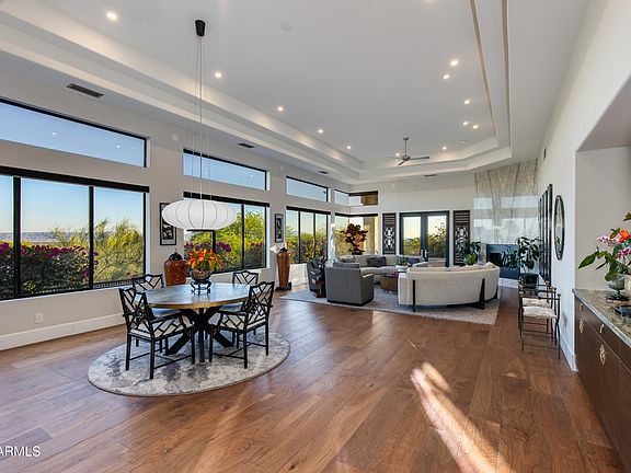 Perched on a serene hillside in the guard-gated Biltmore Hillside Villas, this turn-key home offers luxury living and stunning views. Completely remodeled with high-end finishes, it features an open-concept layout filled with natural light and expansive windows framing city and Camelback Mountain views. The modern kitchen includes custom cabinetry, a large island, and premium appliances. Soaring ceilings and a sleek fireplace enhance the spacious living areas. The primary suite offers a spa-style bath and custom walk-in closet. Two additional ensuite bedrooms and a den provide flexibility for guests, office, or media room. Outdoor terrace is ideal for entertaining with a built-in BBQ, spa and putting green. Located just minutes from world-class golf, hiking trails, shopping and dining.