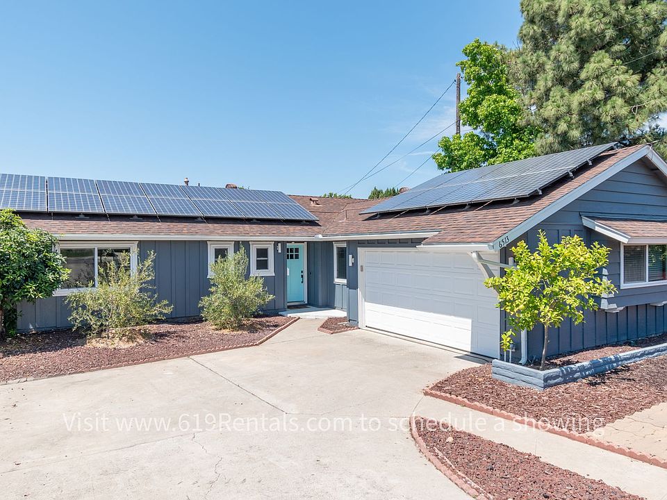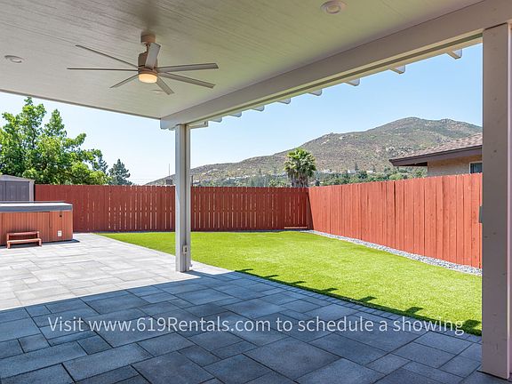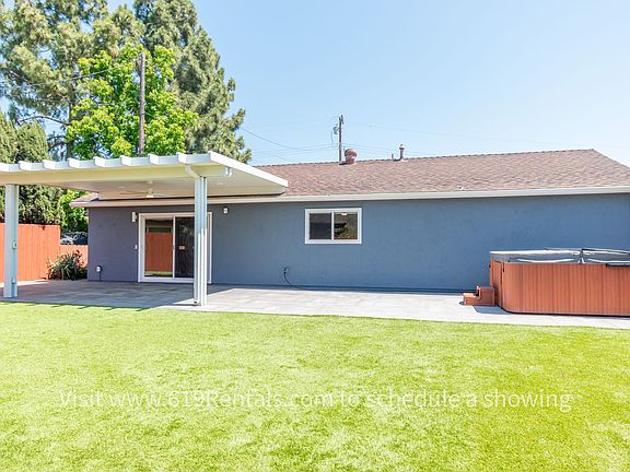 Beautiful 3 bedroom, 2 bath house with 2 car garage on quiet San Carlos street. Pristine backyard area with covered patio, artificial turf, jacuzzi and amazing view of Cowles Mountain. Kitchen has like new cabinets, stainless appliances and granite counters. Hardwood flooring throughout. Dining area off kitchen with beautiful fireplace (non-functional, decorative only). Washer & Dryer included in spacious garage. Both bathrooms recently remodeled with nice tile, fixtures and more. Ceiling fans in all rooms and patio. Recessed lighting in living room, kitchen and dining rooms. Large solar array on roof pays for a large amount of the electricity usage. Tenant pays all utilities. Security deposit is the same as 1 month's rent. Up to 2 pets allowed with breed restrictions. 1390 square feet.