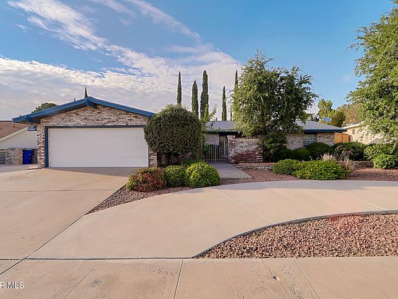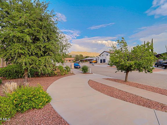 West side living with a daily doze of a beautiful view of the majestic Franklin Mountains in this freshly painted, spacious, 4 bedroom, 1 story, brick style home in a Cul de Sac street. Newly updated kitchen includes stainless steel appliances. Hardwood floor, real wood cabinets and a massive fireplace are just a few of the features this home has to offer. Step into the privacy of a backyard oasis with a sparkling pool and jacuzzi surrounded by tall pine trees and vibrant flowers .Low maintenance turf ! This home is over 2000 square feet and the huge lot offers plenty of space to park your r.v. Coast into your driveway easily in this half circle driveway. Come see it for yourself!
