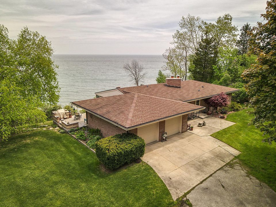Unique Scenic, Panoramic View of Lake Michigan from this Mid Century Modern Design with 210 ft. of Lake Frontage on a 1.39 acre Secluded Lot. Charming great room featuring a wall of windows facing east, vaulted ceilings, Lannon stone fireplace and dining area. Updated kitchen with Woodmode cabinetry and appliances. Screened porch and rebuilt patio with grill -perfect for entertaining. 2 spacious bedrooms and vintage bathroom. Beautifully finished lower level family room with built-ins and surround sound, nearby 1/2 bath, craft area plus storage and laundry space. Security system and central vac. Yes, there is a beach with protected shoreline and 3 stone piers for fishing. A private wooded setting for year round living or a fun, relaxing get-a-way!