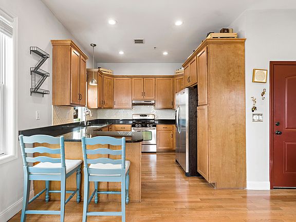 Beautiful corner top floor unit 3 bed 1 bath condo, flooded with natural light boasts 1100 sqft, hardwood floors throughout, open concept layout, bay windows with NYC skyline views, and soaring 12ft ceilings! The spacious kitchen offers 42" maple wood cabinetry with new hardware, new backsplash, SS appliances, and a granite countertop breakfast bar! All bedrooms have custom shelving in large closets and the rear bedroom comes with light filtering shades. Completely renovated spa-like bathroom, central air & heating, new water heater (2019), new security and doorbell system with cameras controlled by smartphone app, in unit W/D, ample closet space, and a private storage unit in the basement. Recently installed automatic garage door system for 1 car deeded parking! Enjoy the lifestyle of this active community! 1 Block away Bergenline Ave., offers a variety of international restaurants, convenience and retail stores. Washington Park offers basketball courts, a soccer field, and a playground. 24/7 public transportation via NJ Transit buses and jitneys provides quick and easy commute into NYC.