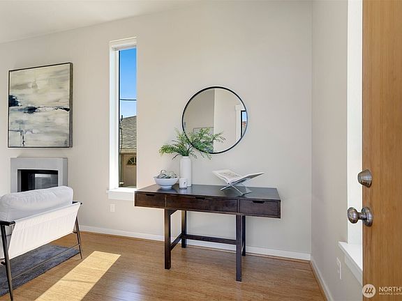 Huge $75K Price Improvement! Stunning contemporary 3-bedroom, 2.5-bath home with like-new finishes, abundant natural light, bamboo flooring, soaring ceilings, and a bright, open-concept layout. The gourmet kitchen showcases cherry cabinetry, granite countertops, stainless steel appliances, and two spacious pantries. The luxurious primary suite features vaulted ceilings, a beautifully tiled bath with a large walk-in shower, and a generous walk-in closet. Step out to the rooftop deck via sliding glass doors and take in sweeping views of Mount Rainier and the city skyline. Additional highlights include a 1-car attached garage, extra off-street parking, a fully fenced, level, low-maintenance backyard, and efficient mini-split heating & cooling.